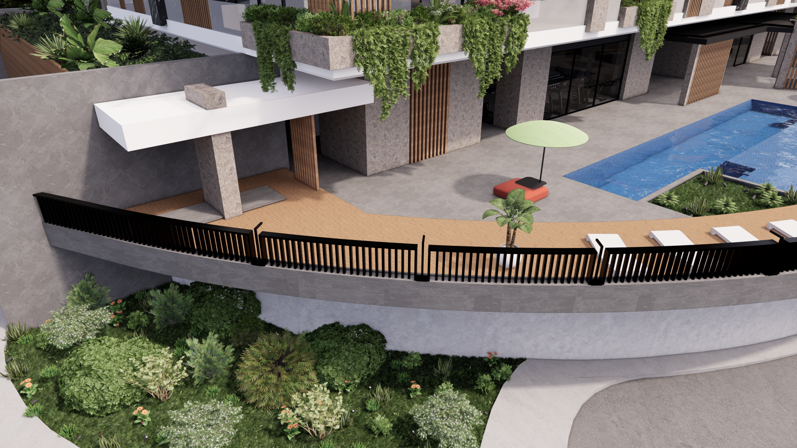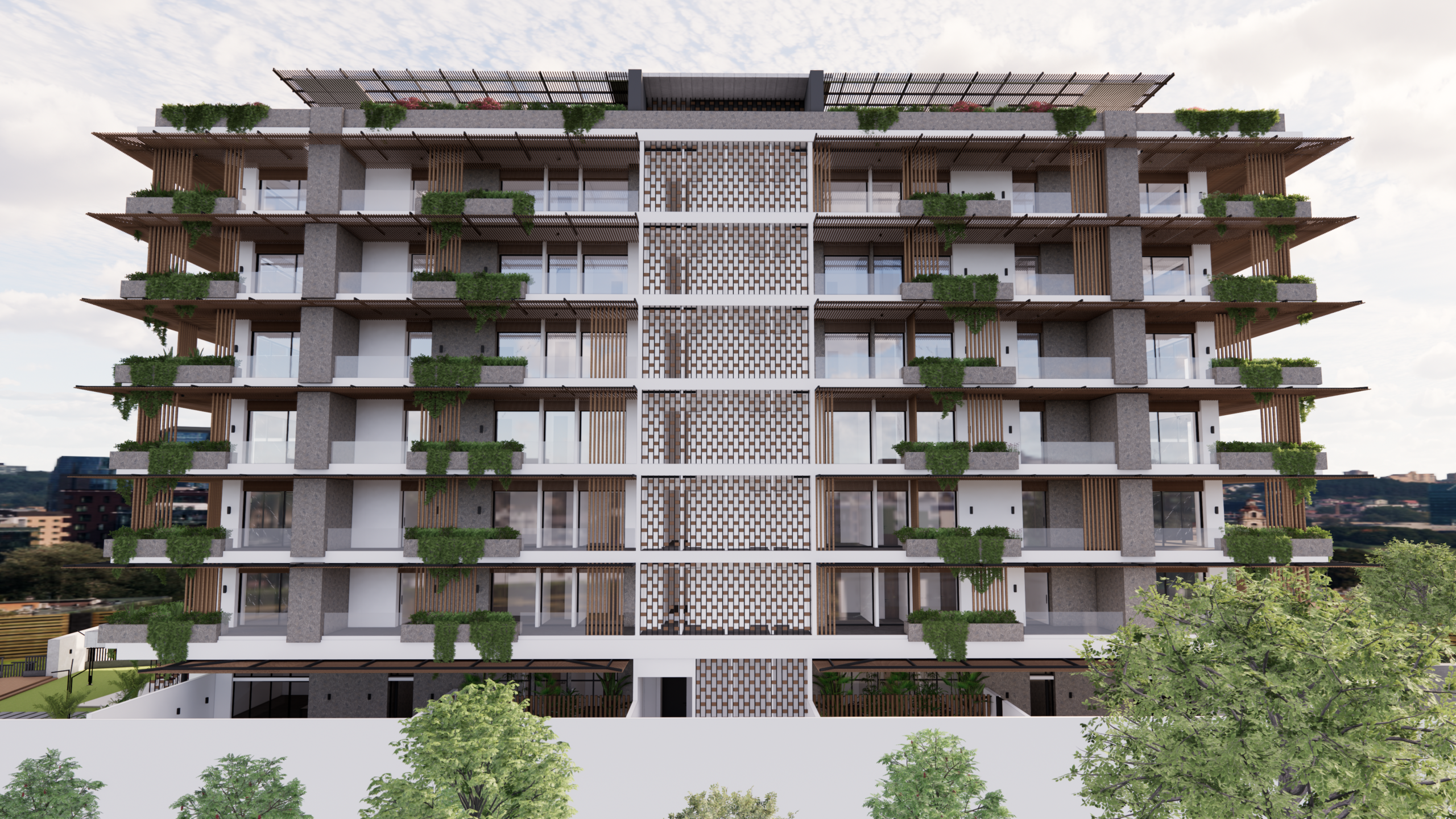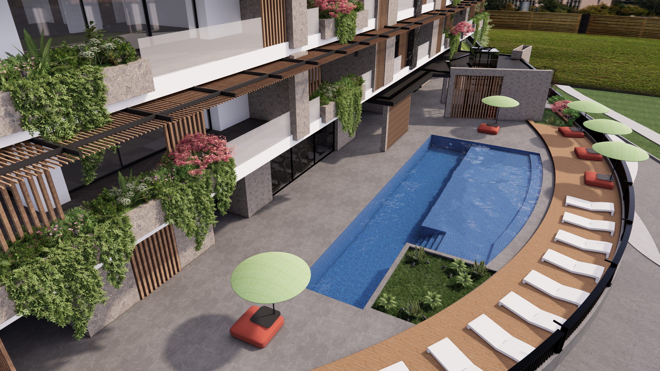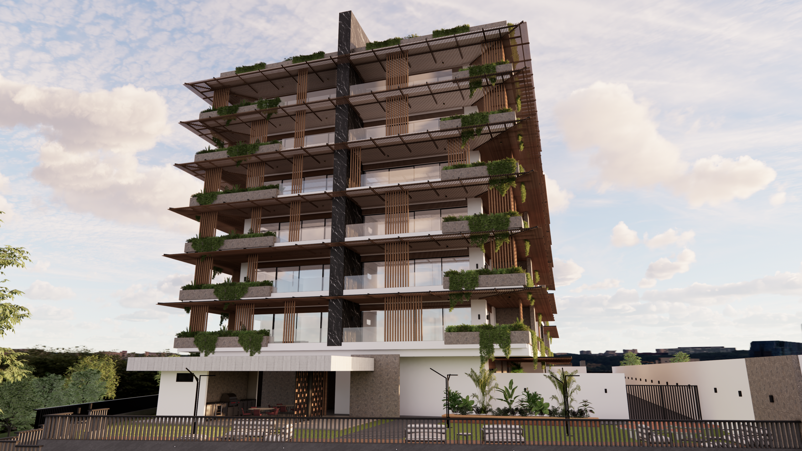Esa visión se tradujo en una propuesta formal que combina volúmenes escalonados, balcones amplios y líneas depuradas. La composición evita la rigidez y propone un ritmo visual que acompaña la vida cotidiana del residente: luz que entra de manera controlada, espacios que conectan interior y exterior, materiales que aportan serenidad sin caer en artificios.