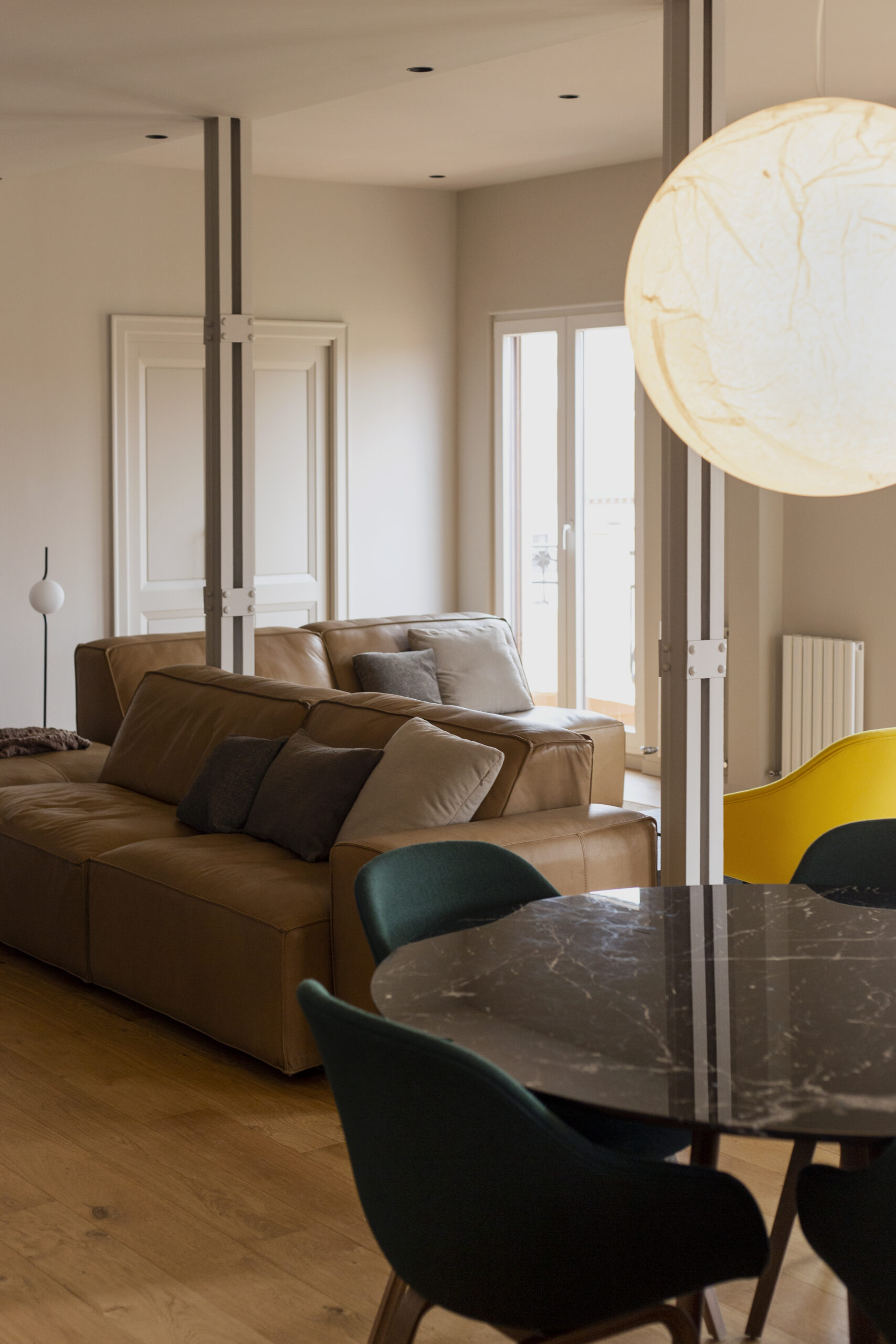 3. Las columnas metálicas existentes se integraron cromáticamente para desaparecer sin añadir ruido visual.