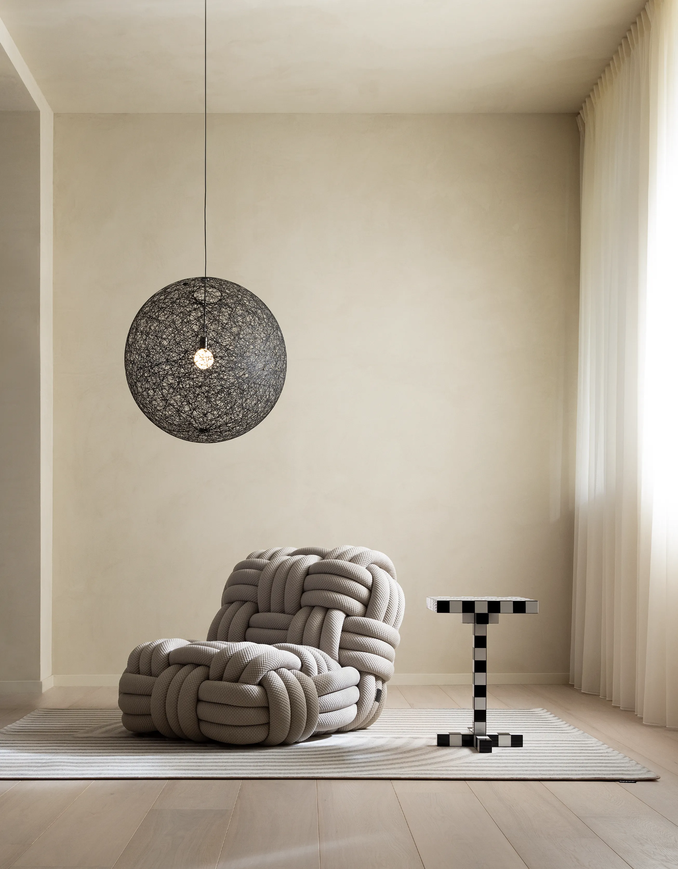 La Knitty Lounge Chair es una declaración de escala y textura. Construida con hilos de gran diámetro que evocan cuerdas náuticas, la pieza se teje en una trama gruesa que transforma el asiento en una experiencia táctil envolvente. No es solo un asiento; es presencia.