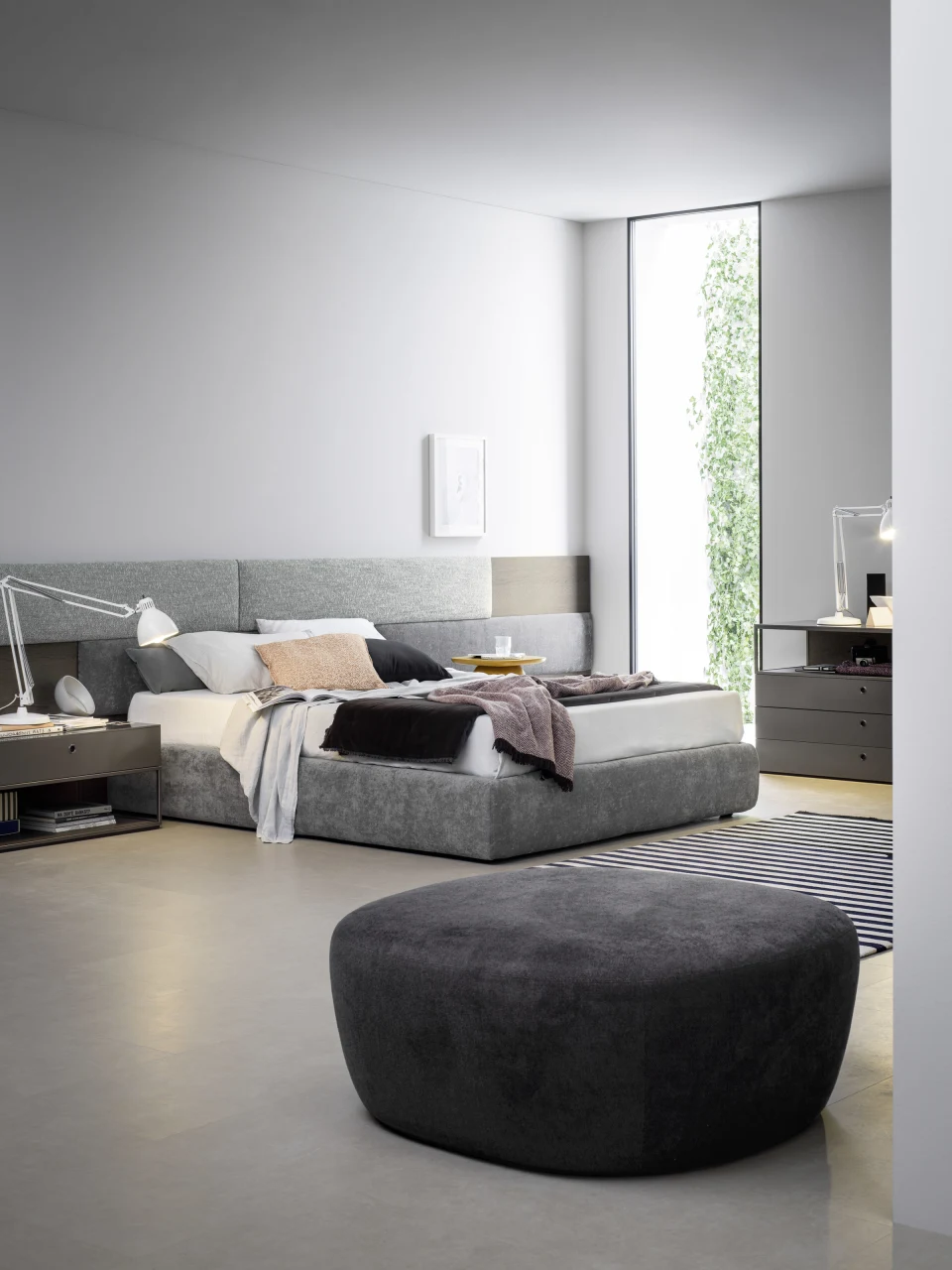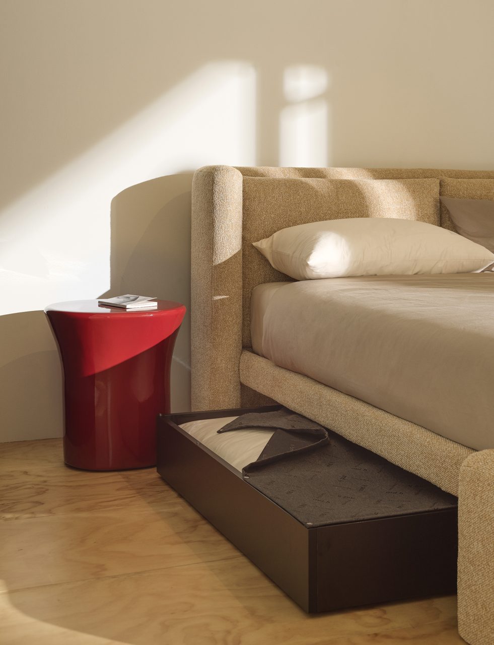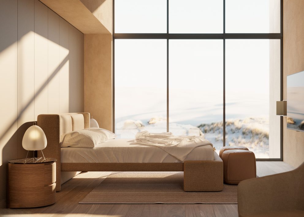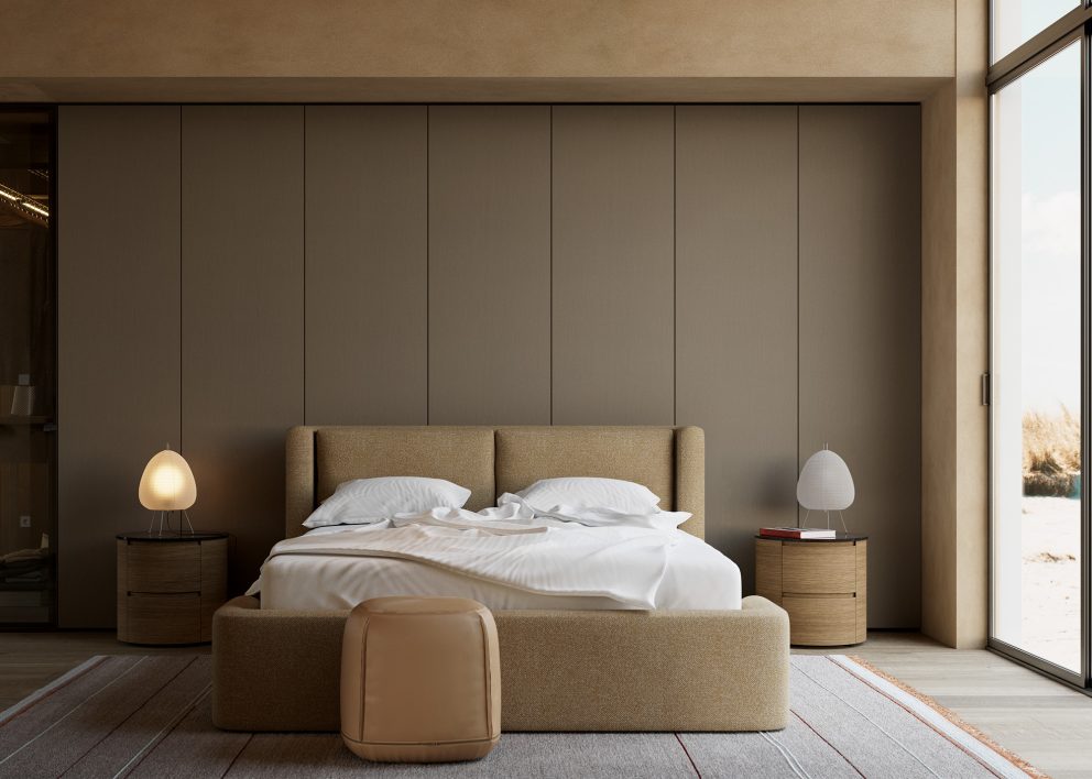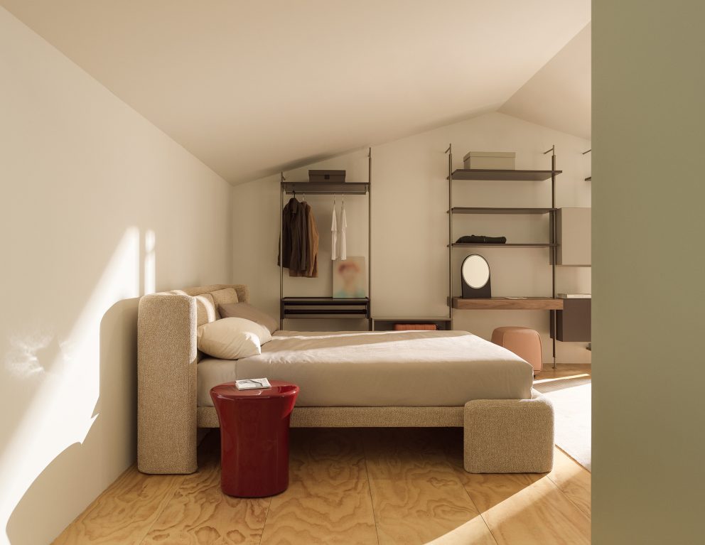 La cama Dimora es prueba de ello. Dos estructuras envolventes “abrazan” el lecho, generando una silueta cónica que introduce verticalidad y solemnidad sin perder intimidad. La pieza juega con opuestos: suavidad y firmeza, contención y teatralidad. Su volumen transforma el dormitorio en un espacio con carácter definido, donde el mobiliario no acompaña el ambiente, lo determina.