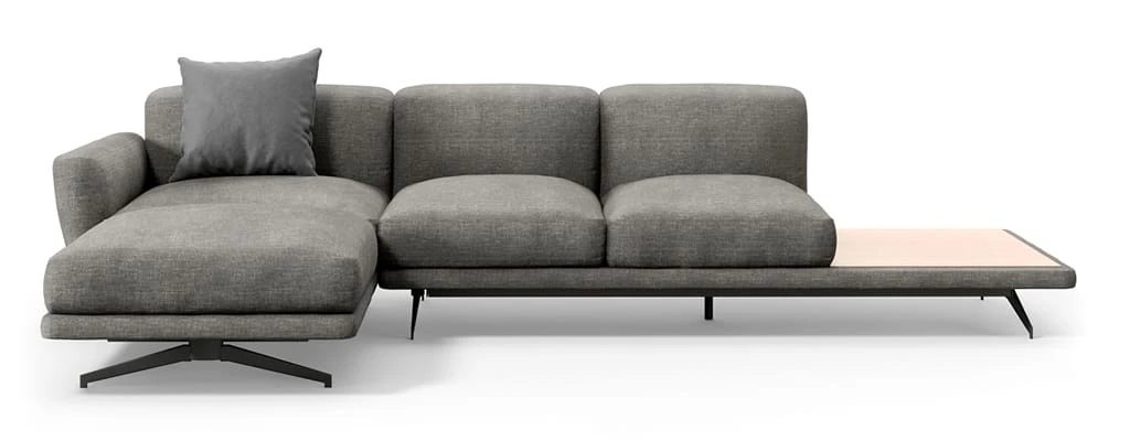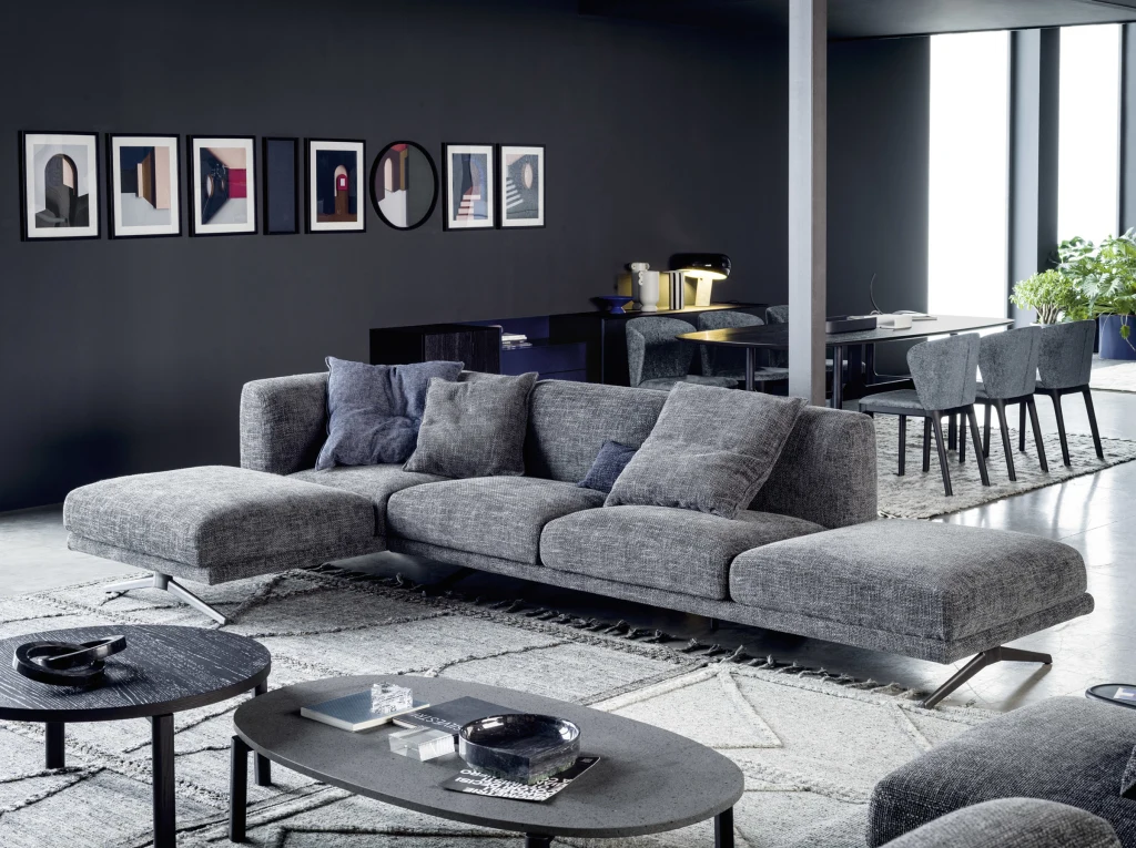El sofá Noah, una de sus primeras propuestas para la firma, sintetiza esta aproximación. Concebido como un sistema modular, permite configuraciones lineales o en L mediante secciones combinables con o sin respaldo. Más que un sofá adaptable, plantea una forma de organizar el espacio desde la horizontalidad.