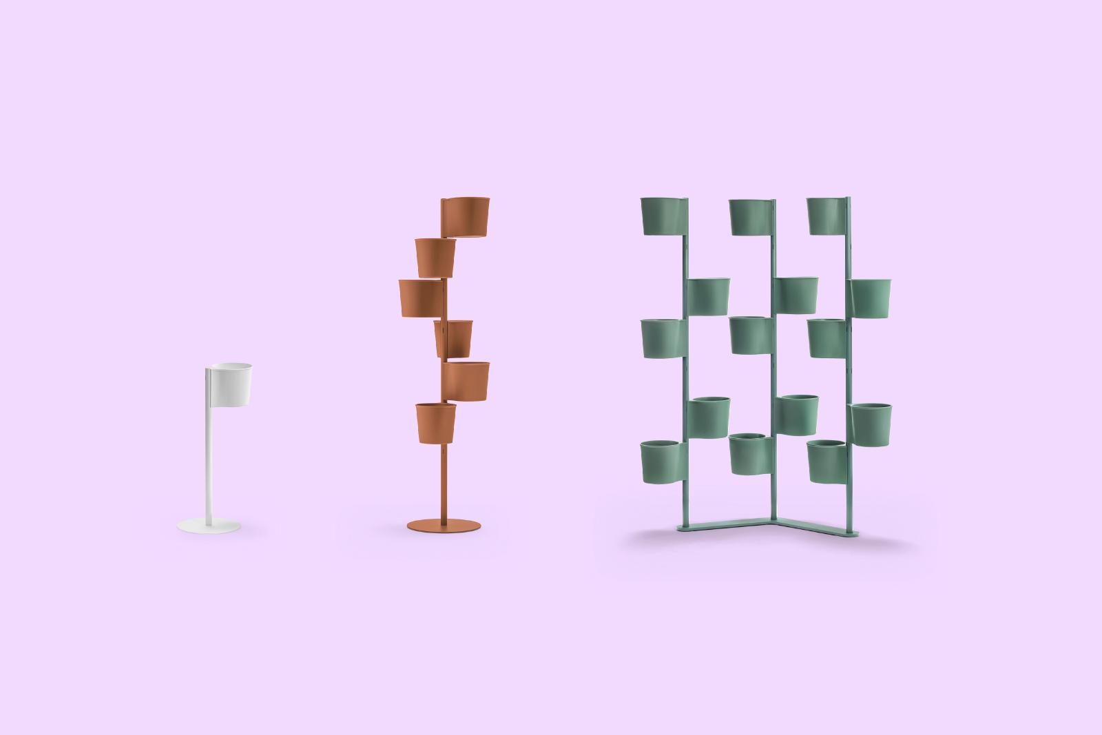 Más que una colección de materos, Hevea propone una estructura modular capaz de configurar divisiones verdes en oficinas y espacios de hospitalidad, adaptándose a distintas escalas y usos sin alterar su lógica constructiva.