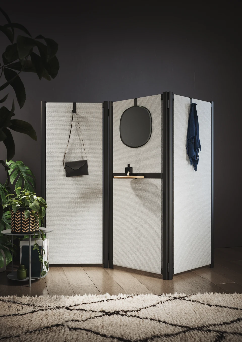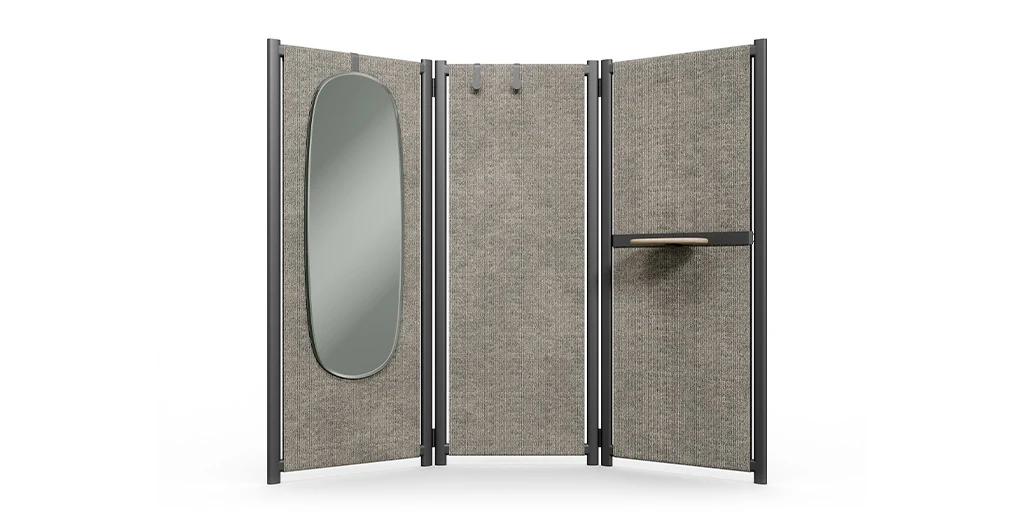Esa misma lógica de reinterpretación se extiende al divisor Shy que actualiza el biombo clásico desde una estructura metálica sobria y contemporánea. Su capacidad para incorporar accesorios como espejos, bandejas o ganchos amplía su función más allá de la simple separación.