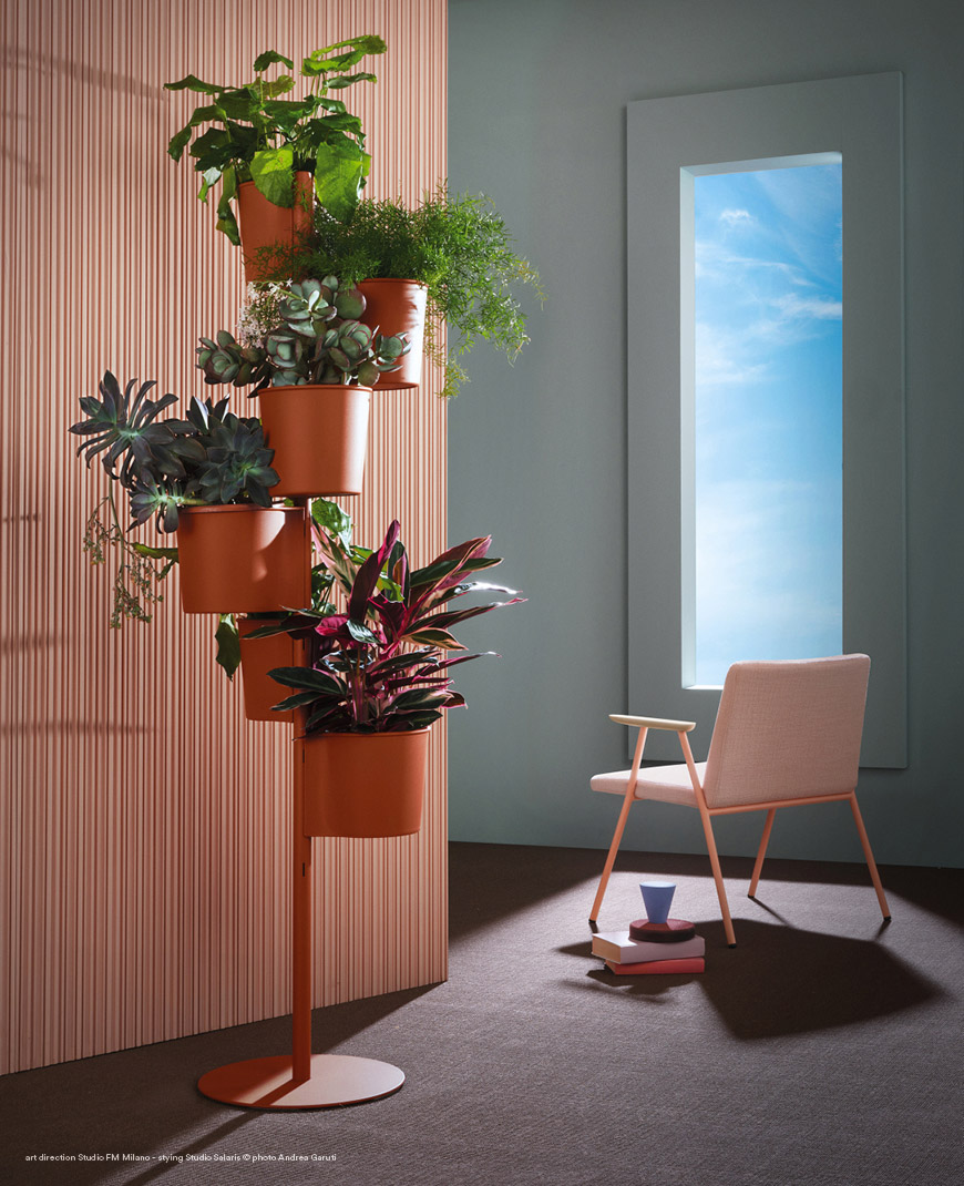 Su colaboración con la firma italiana Pedrali, referente internacional en mobiliario contemporáneo y producción industrial de alta calidad, dio origen a la serie Hevea, un sistema que transforma la relación entre vegetación y arquitectura interior.