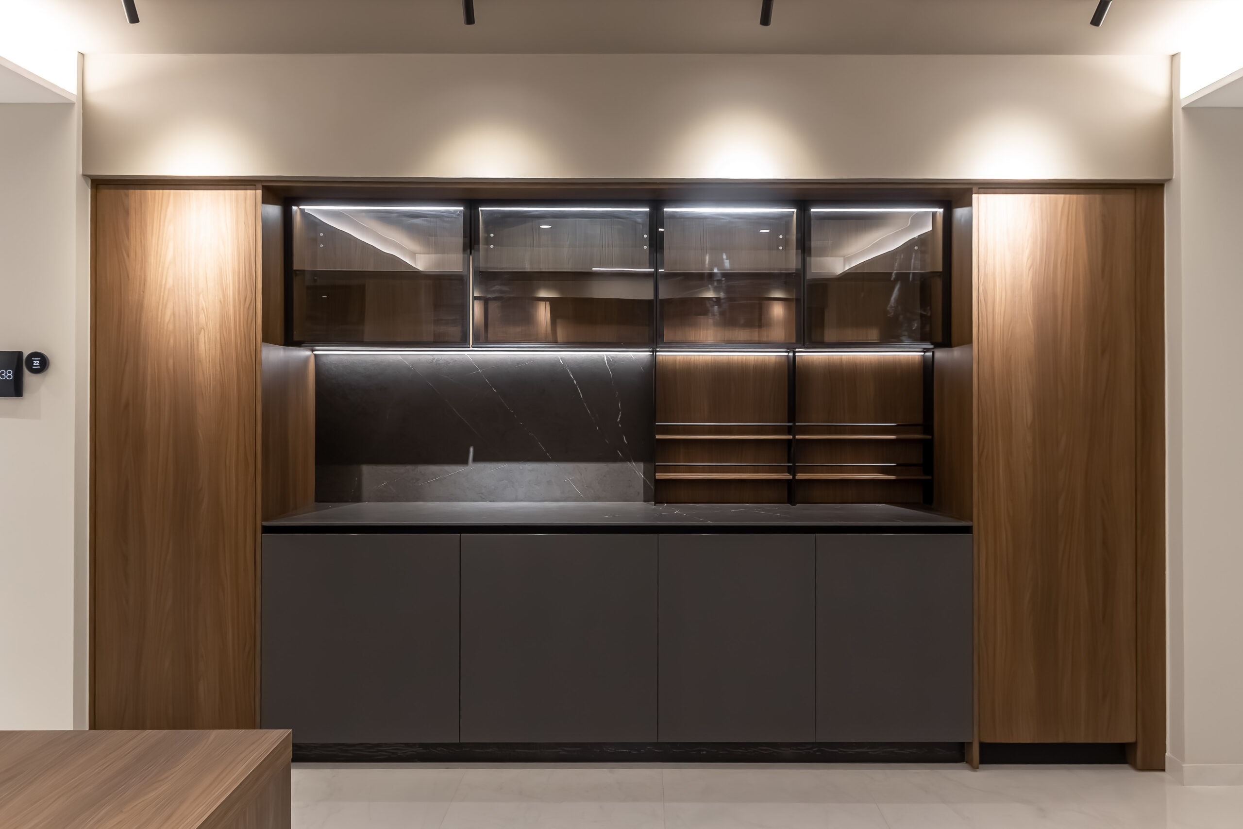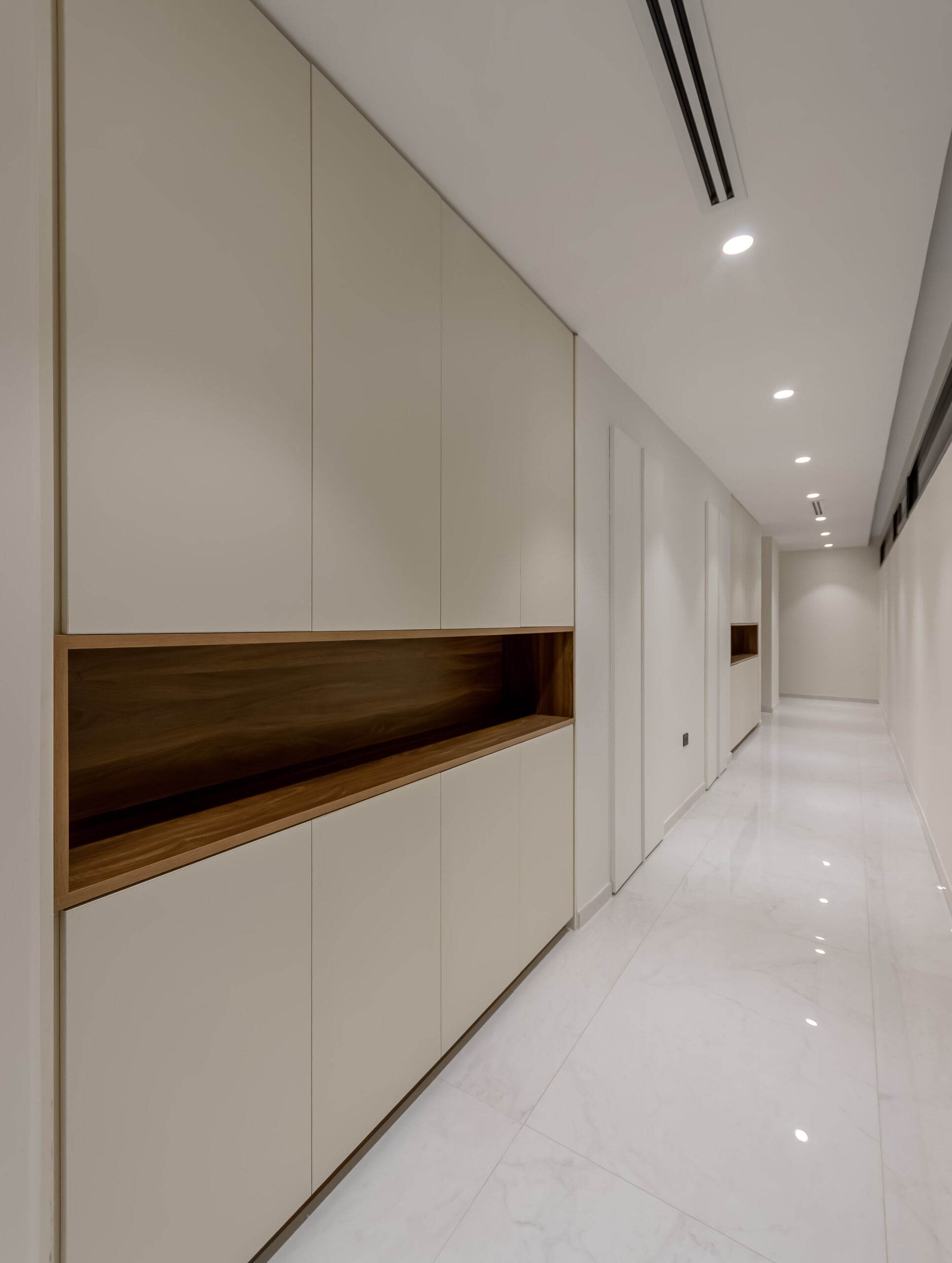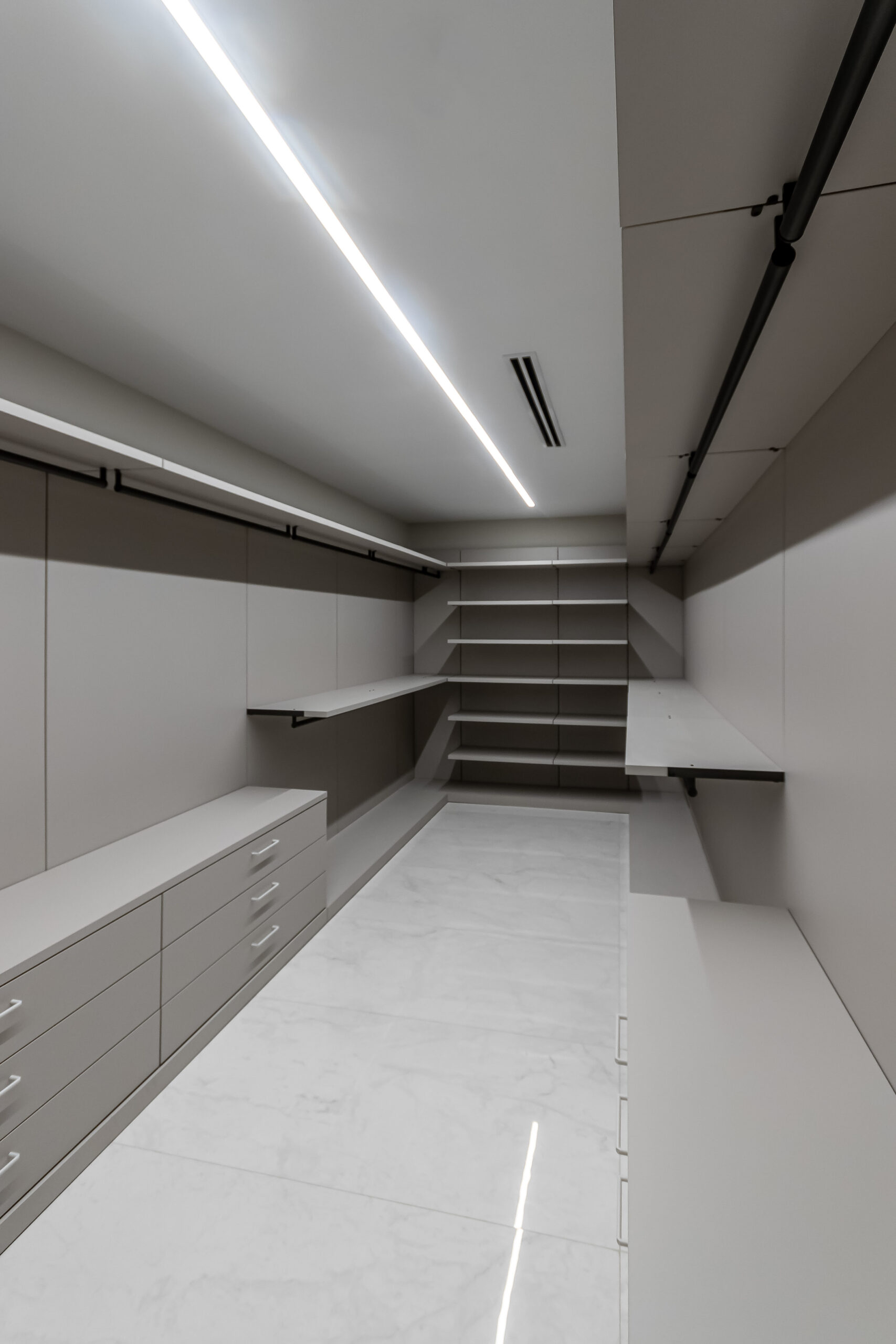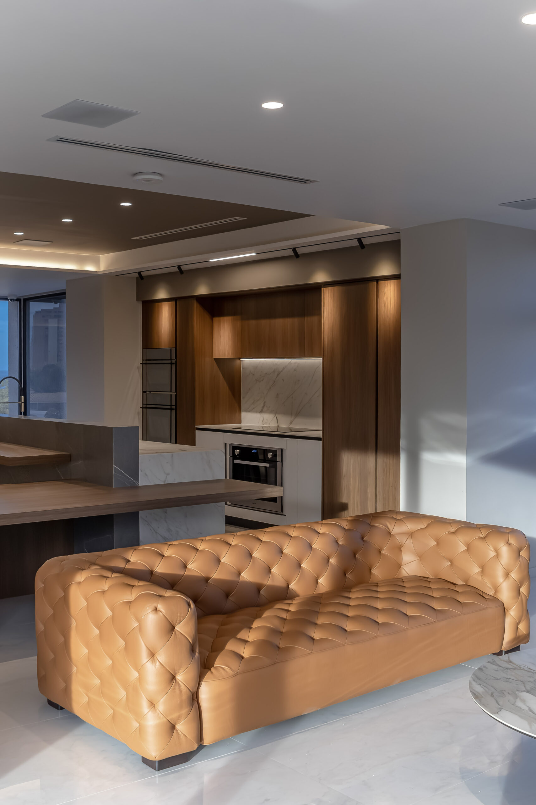 En los niveles superiores se desarrollan tres apartamentos exclusivos, cada uno diseñado para ofrecer amplitud y funcionalidad. Las unidades incorporan tres habitaciones, tres baños, vestidores amplios y áreas integradas de sala, comedor y cocina, generando espacios residenciales que equilibran privacidad y apertura.