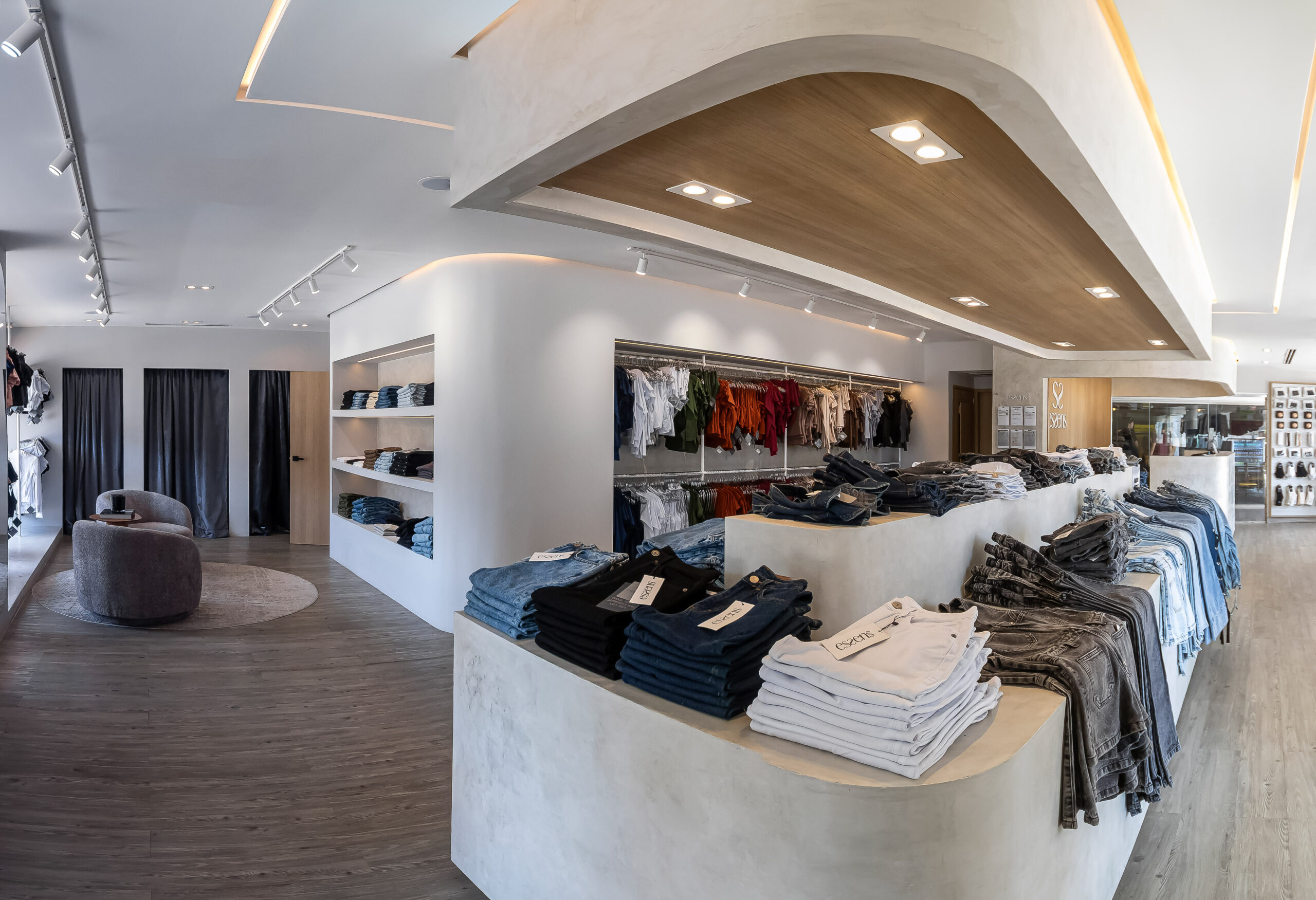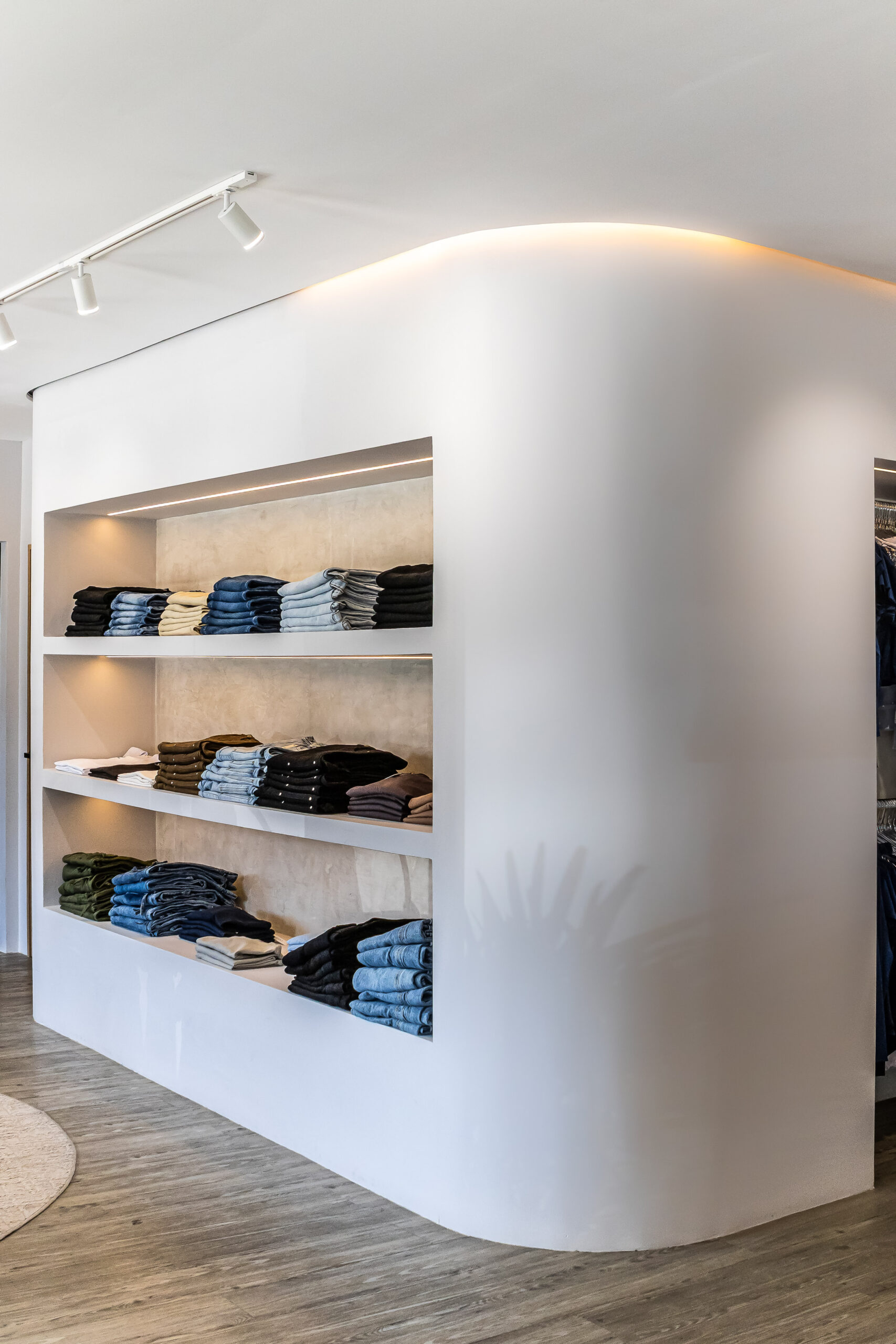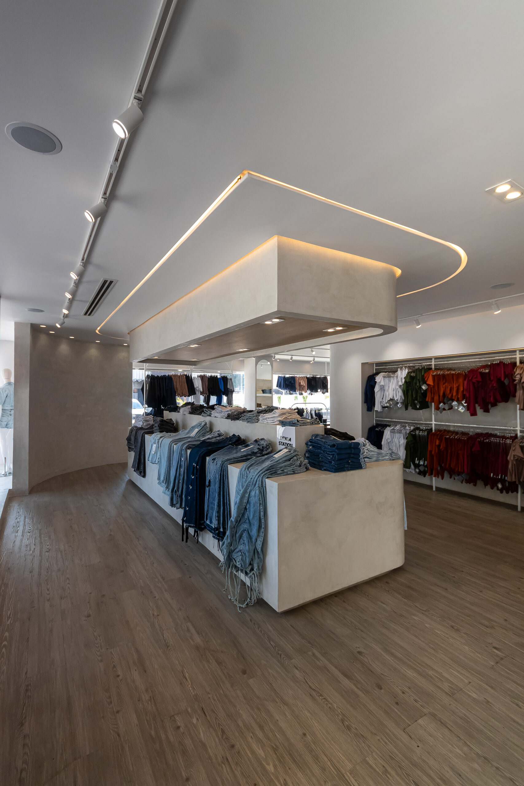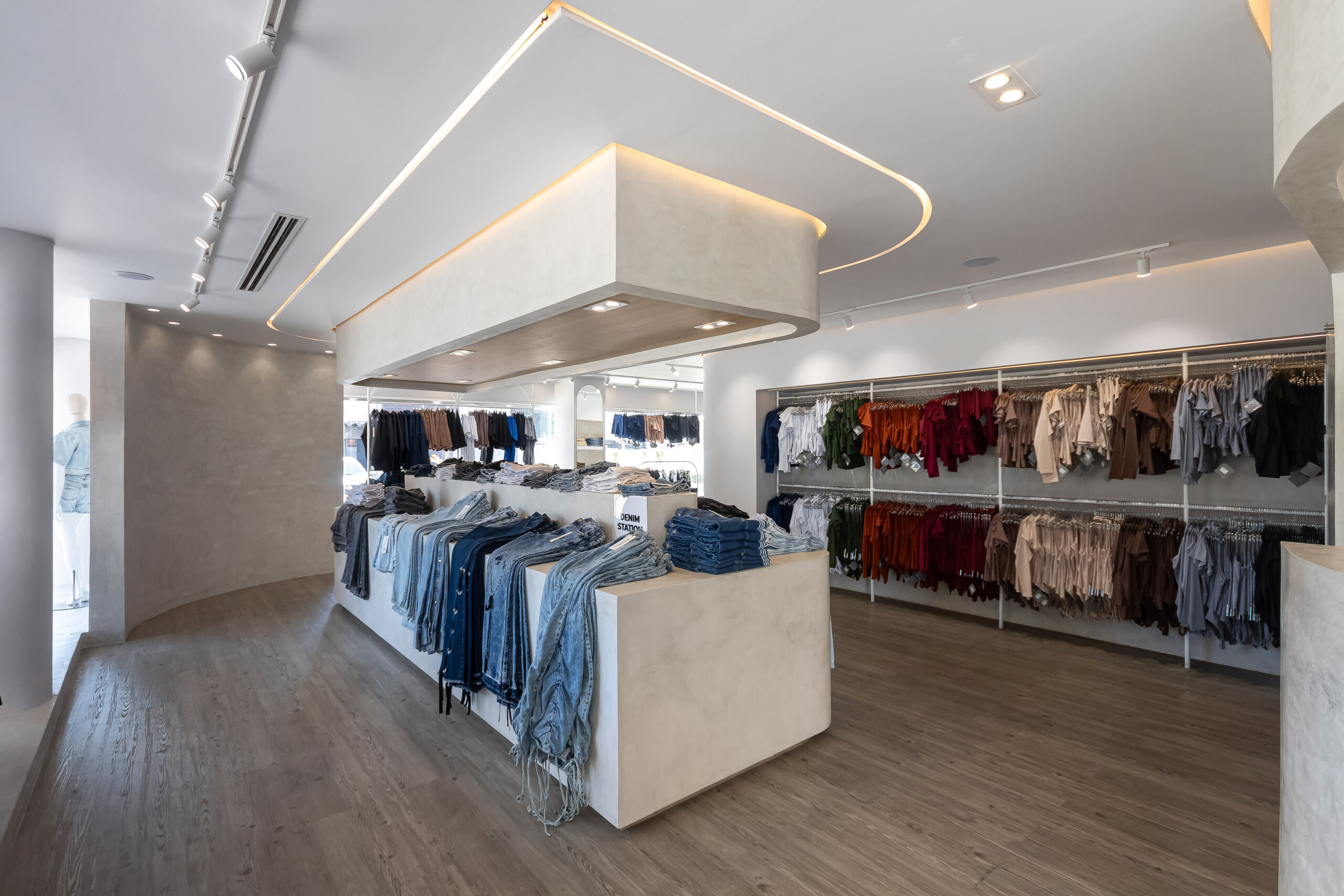 El diseño interior se apoya en una paleta esencial de piedra, mármol y acabados tipo madera, elegidos por su neutralidad y calidez. Estos materiales definen un entorno minimalista que acentúa las líneas puras y pone el foco sobre las prendas.