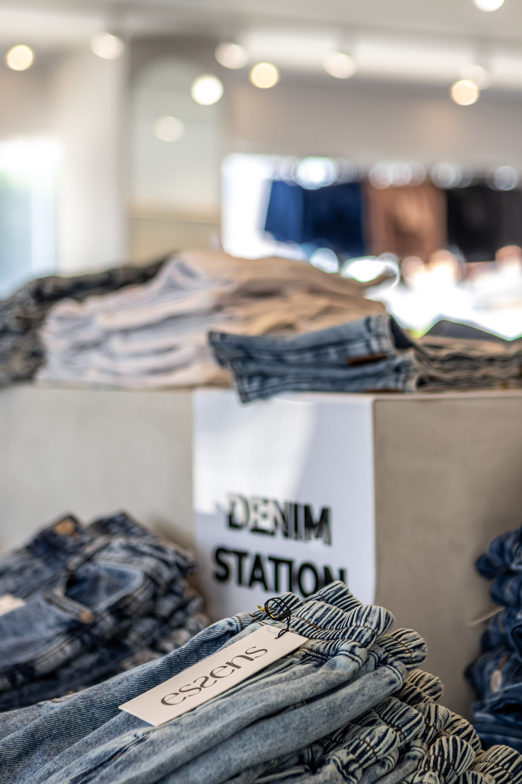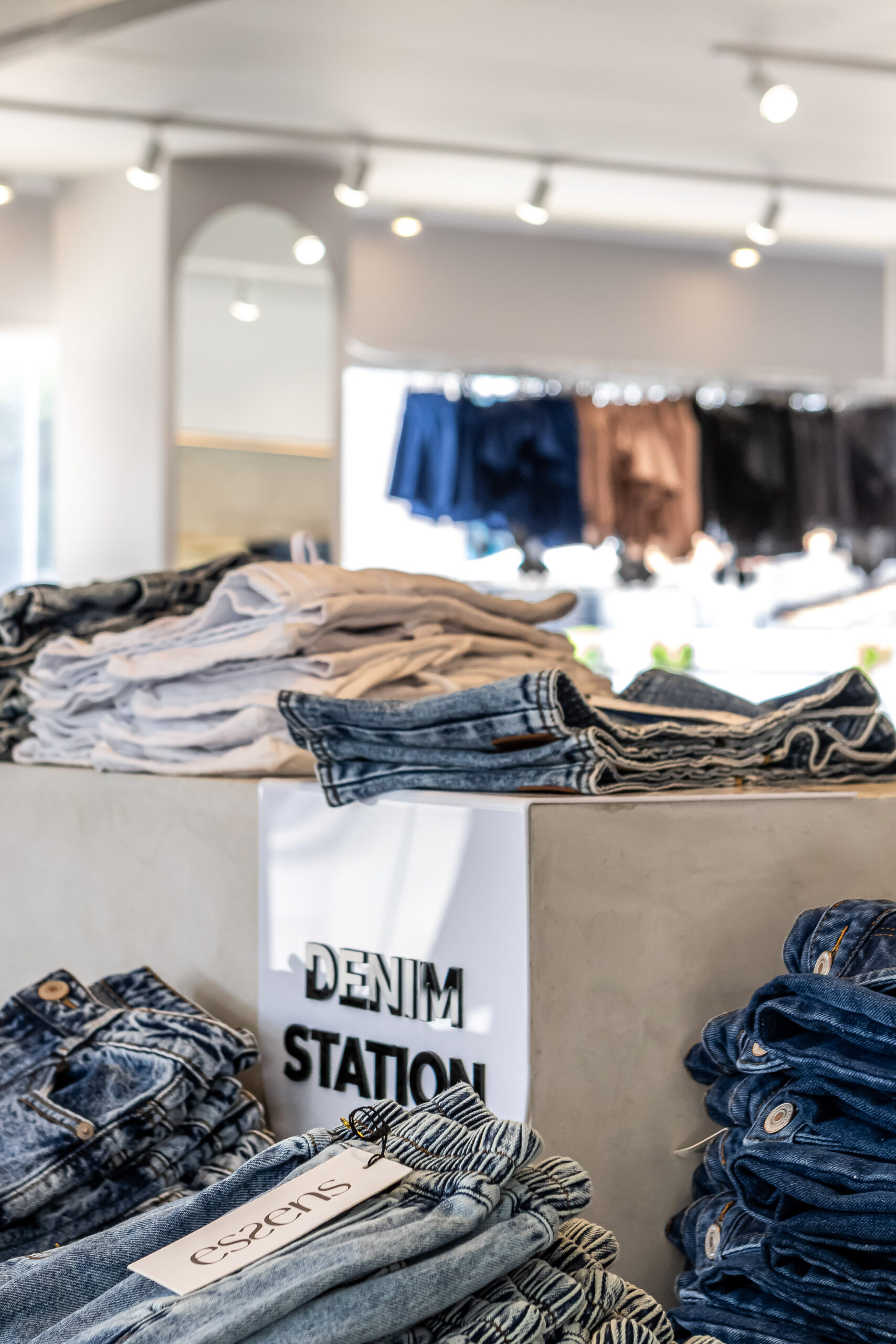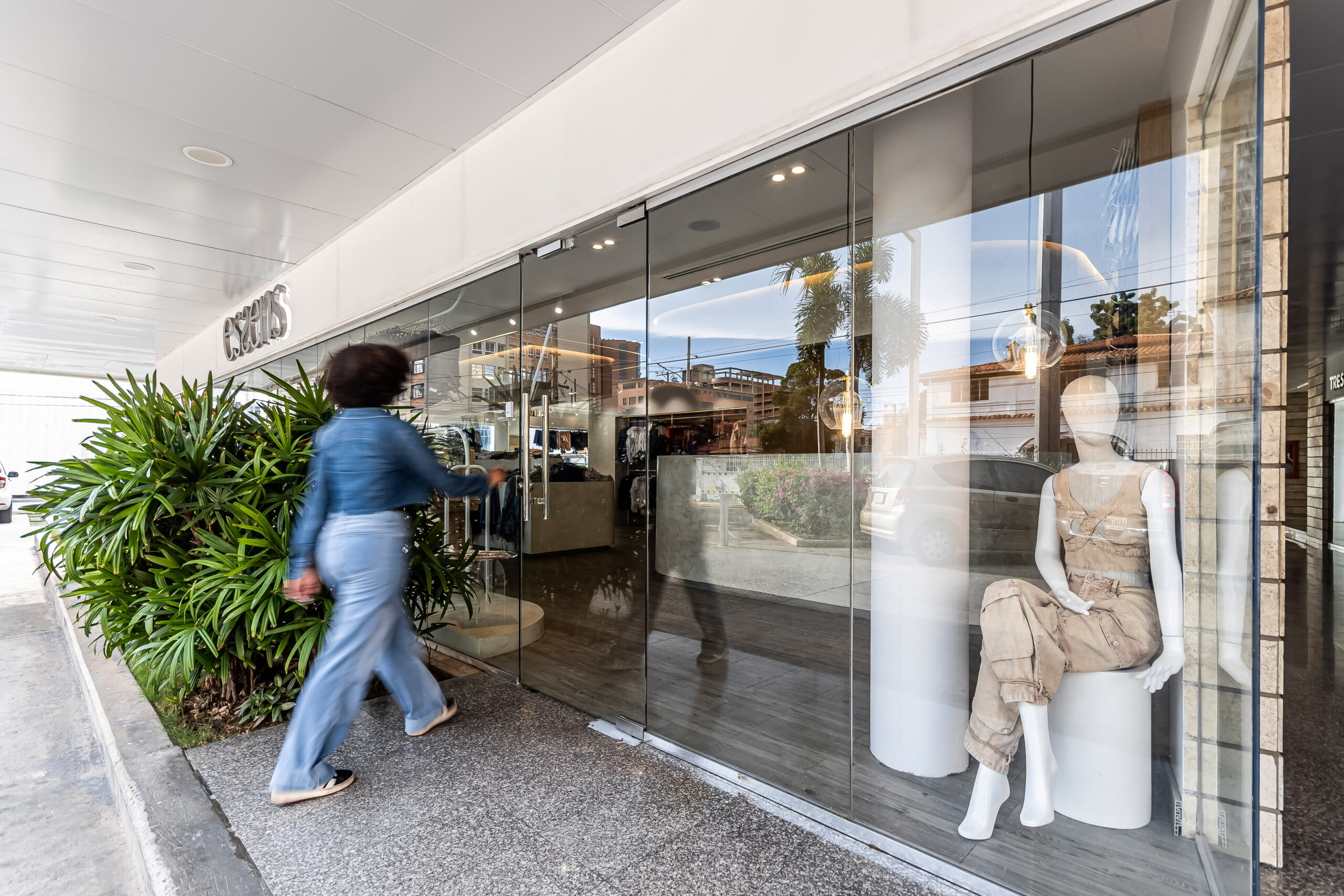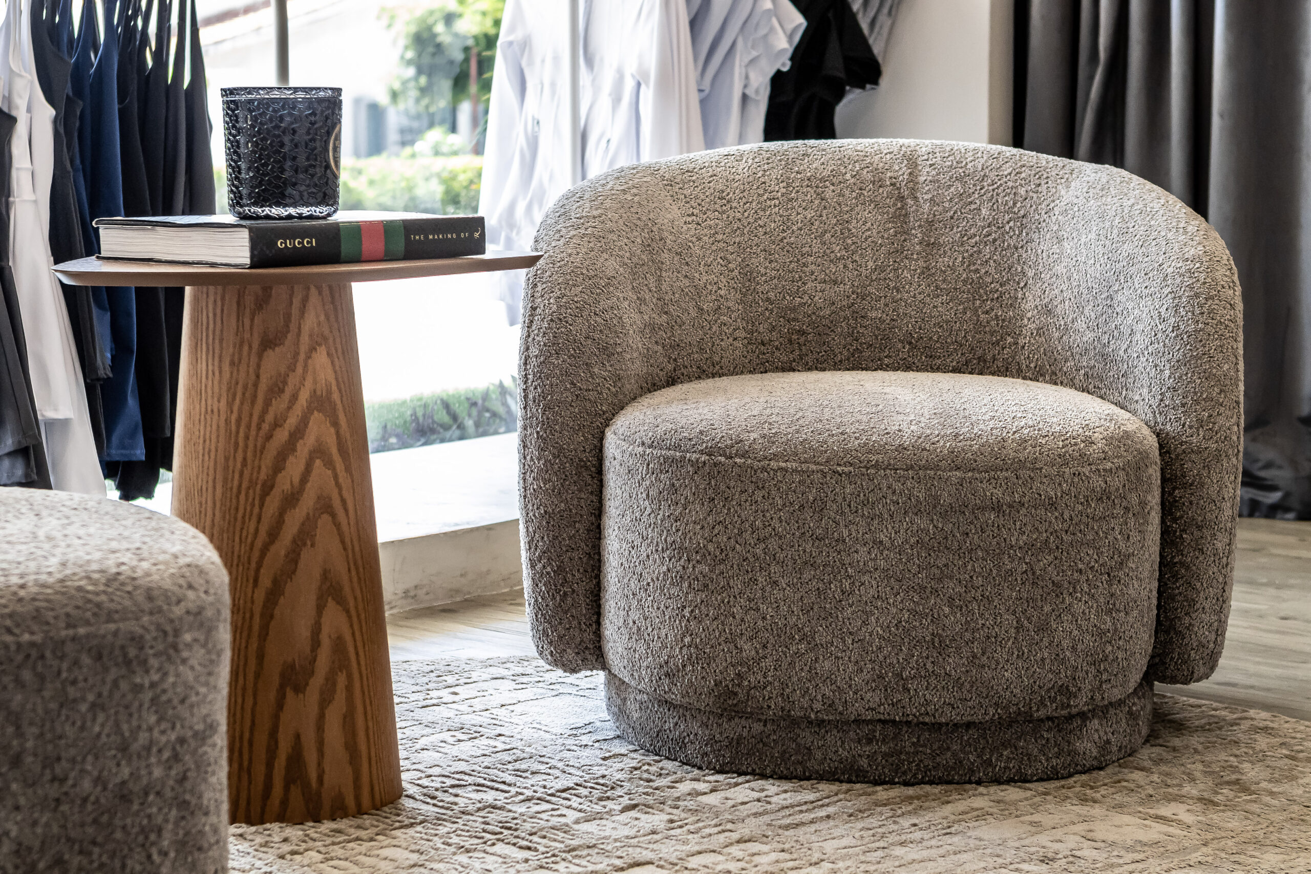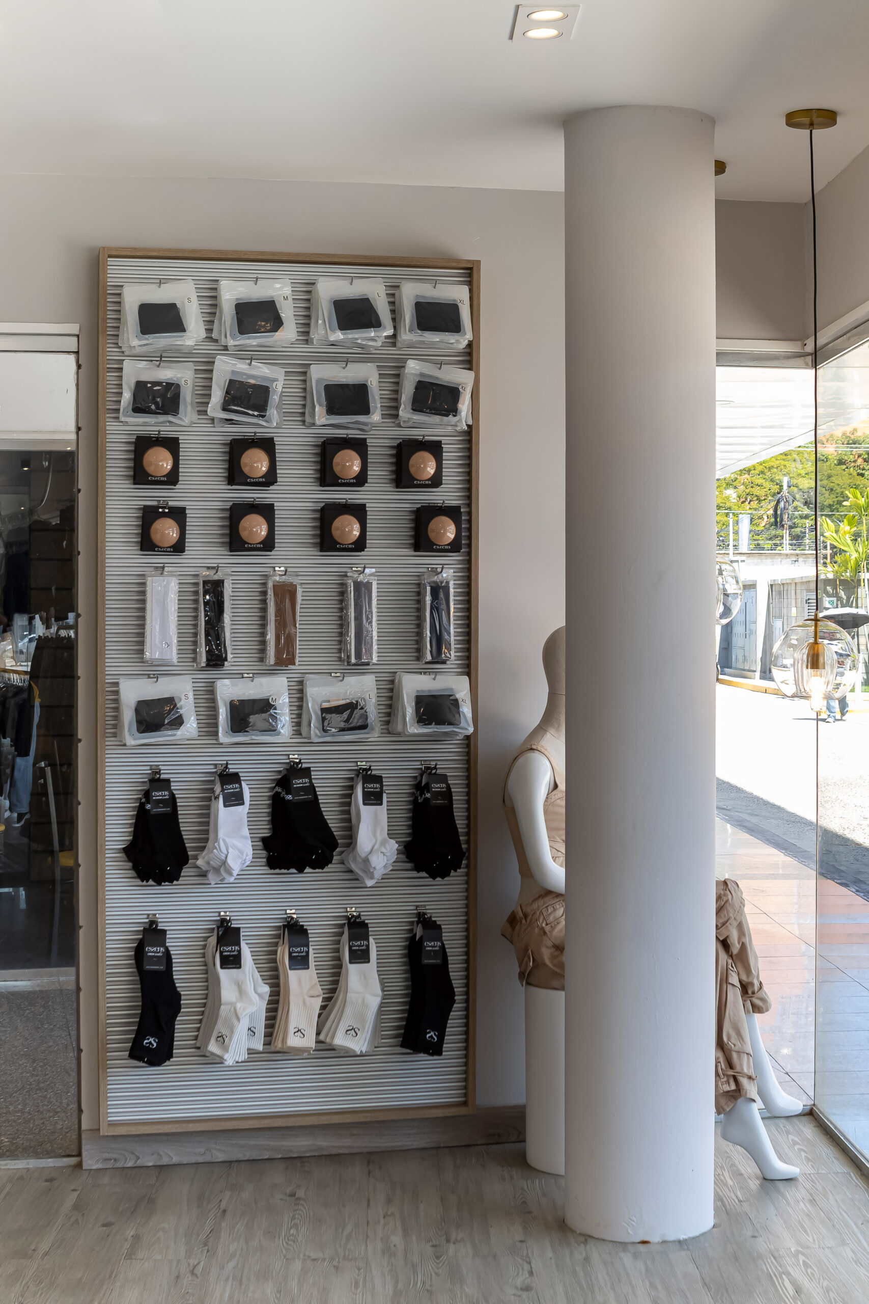 El diseño interior se apoya en una paleta esencial de piedra, mármol y acabados tipo madera, elegidos por su neutralidad y calidez. Estos materiales definen un entorno minimalista que acentúa las líneas puras y pone el foco sobre las prendas.