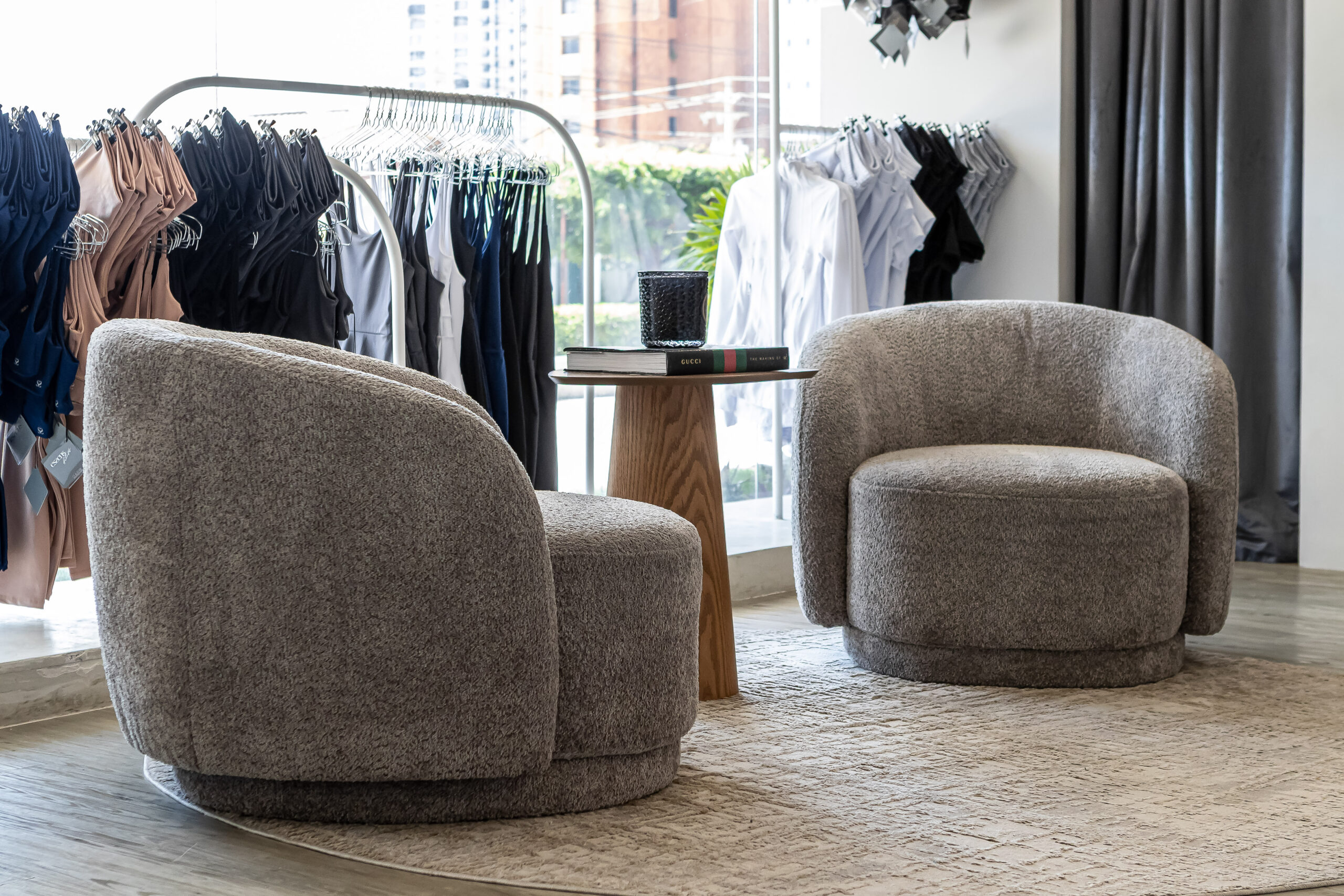 El área de probadores se concibió como una extensión del espacio comercial: amplia, sobria y cómoda. A un lado, un pequeño living elegante permite a los acompañantes esperar sin romper la estética del conjunto.